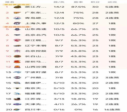 浙江稠州5连胜被终结,以9胜7负积25分暂列第7名,约克14投7中空砍了22分,刘泽一和兰道夫都是14分。吉林在客场103-79送四川16连败,摩尔和威尔逊都是拿到了20分,这是吉林赛季第7场胜利,以7胜9负暂列第10名。山东和江苏的比赛打到了加时赛,江苏106-101爆冷掀翻山东,迎来两连胜,同时终结了山东的8连胜!庞峥麟15投5中,15罚10中拿到了26分8篮板13助攻,亨特贡献了23分6篮板,山东球员克里斯空砍了20分8篮板,陈林坚24分,目前以10胜5负暂列第5名。