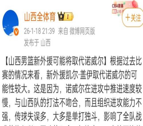 山西媒体人透露,这次更换外援,山西男篮基本确定会换掉诺威尔,这样的举动也是让其他球队的球迷感慨,毕竟很多球队都需要诺威尔这样能够得分的外援。