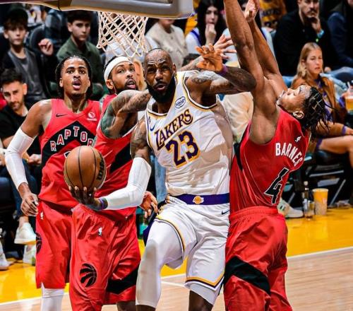 猛龙拉开分差后,文森特三分救火,后半段马穆克拉什维利下三分雨,巴恩斯突破炸扣,第一节湖人23-30猛龙。第二节老詹三分+艾顿空接追平比分,詹姆斯继续单打巴恩斯,艾顿上篮,老詹带队打出小高潮,东契奇也续上三分球,艾顿空中摘星举火烧天,猛龙有些顶不住。中段马穆克拉什维利连续得分止血,英格拉姆军训八村塁,连续上分带队反超!东契奇三分止血,英格拉姆继续造三分犯规!东契奇撤步压哨三分命中,半场湖人55-54猛龙,詹姆斯迎来生涯(常规赛+季后赛)51000分里程碑!